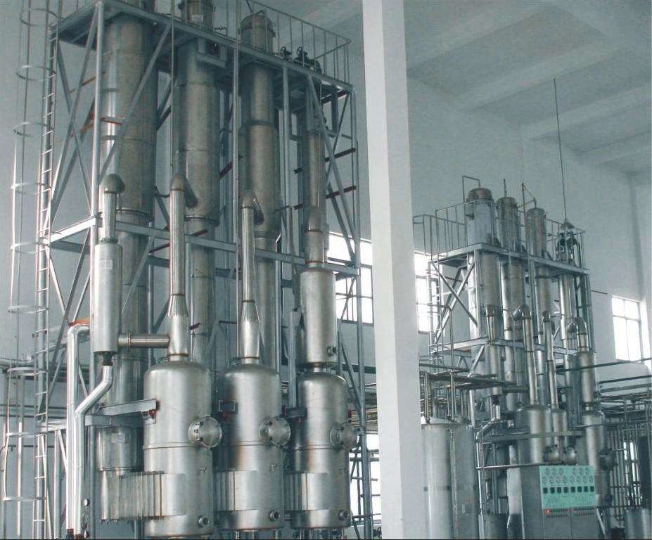 Raw material is fed into pre-heating swirl pipe from storage tank via pump. The liquid is getting heated by vapor from thirdly effect evaporator, then it enters the distributor of thirdly evaporator, fall down to become the liquid film, evaporated by the vapor from secondary evaporator. The vapor moves along with the concentrated liquid, enters thirdly separator, and separated from each other. Concentrated liquid comes to the secondary evaporator through pump, and get evaporated again by the vapor from the first evaporator, and the above process repeat again. The first effect evaporator need fresh steam supply.